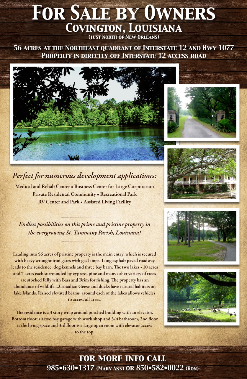 56 acres of beautiful wooded landscape with two large spring fed lakes creating an environment that is highly suitable for a corporate office location, hospitality, planned business campus or institutional. Strategically located in the northeast quadrant of I-12 and LA-1077 in one of the fastest growing and commercially vibrant areas in southeast Louisiana.