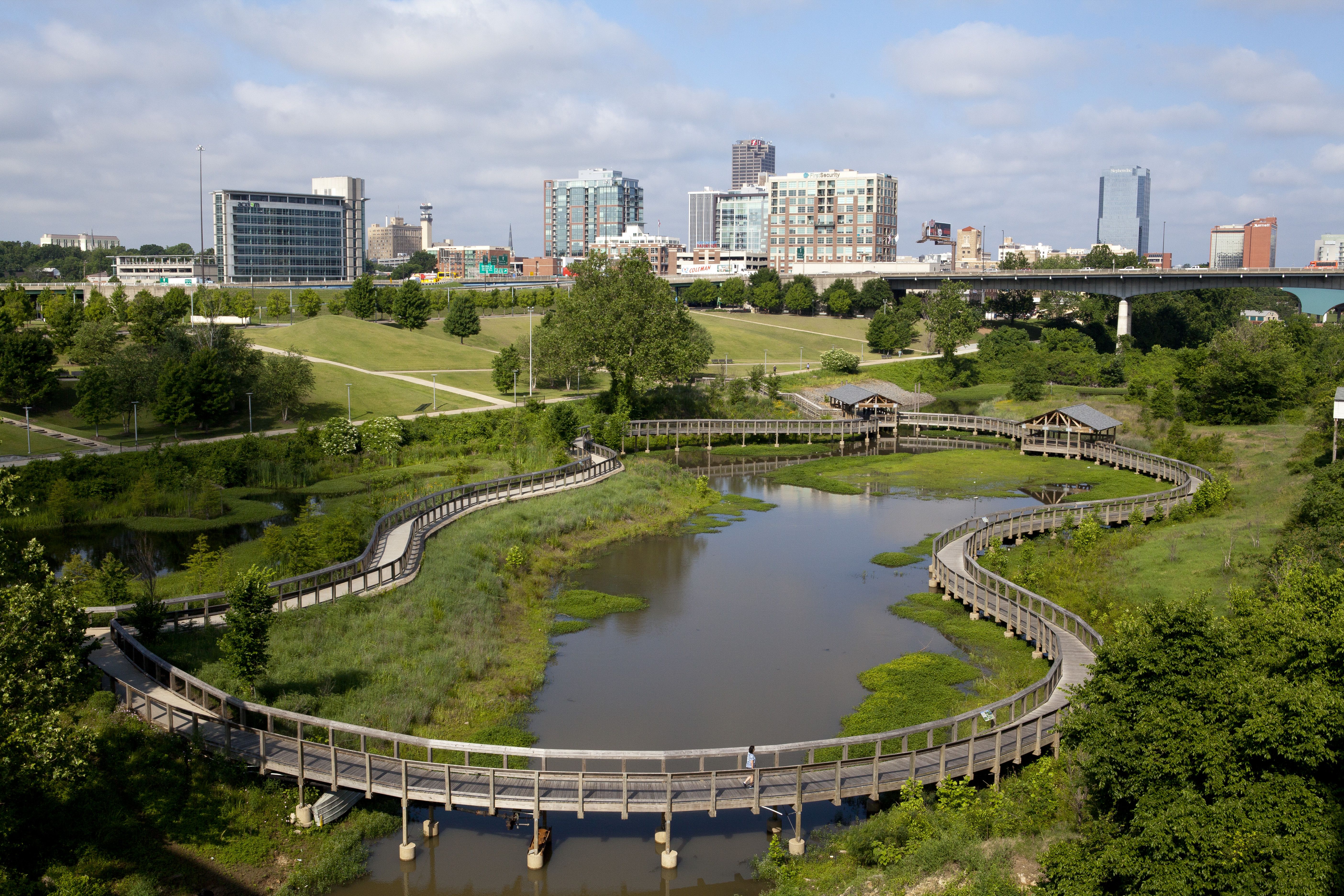 Outdoors: The Little Rock region has an abundance of parks – over 125 parks covering more than 5,000 acres just in Pulaski County, including the 1,700-acre Burns Park, one of the largest municipal parks in the nation. There are also many state and national parks within a 60-mile radius of Little Rock that provide recreation and camping facilities, including Petit Jean State Park, DeGray Lake Resort State Park, Lake Ouachita State Park, the Ouachita National Forest and Pinnacle Mountain State Park. The Arkansas River, navigable from just east of Tulsa to the Mississippi River, flows through the middle of or downtown area. The Arkansas River Trail includes a fourteen-mile bike loop surrounds the Arkansas River, running along the north and south shores and connected by the Big Dam Bridge to the west and the Clinton Pedestrian Bridge to the east. There are also pedestrian bridge crossings at the Junction Bridge and the Broadway Bridge. The River Trail also extends westward to Pinnacle Mountain State Park.